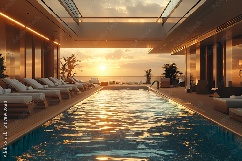 >Obrazy na płótnie Canvas>Swimming Pool on Cruise Ship, water recreation and spa facilities, leisure and relaxation on deck, ocean views and sea journey, travel and vacation on boat, comfort and wellness.