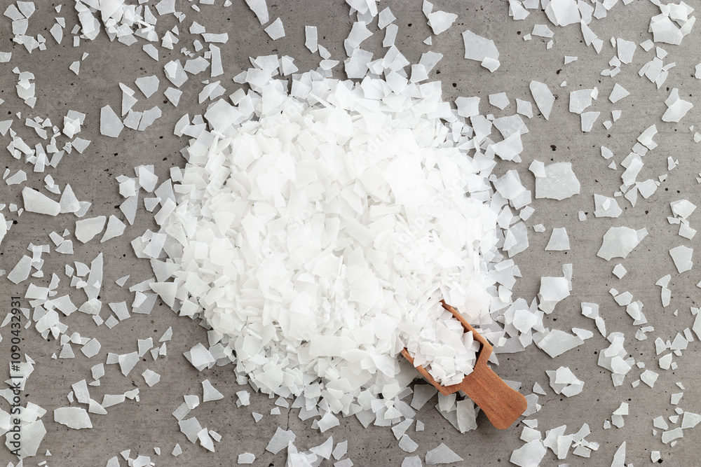 >Obrazy na płótnie Canvas>Top view of magnesium flakes scattered from scoop. Natural sea salt as wellness or spa products for bath or relaxation, self-care or sustainable living, Wellness and Body Function Enhancement