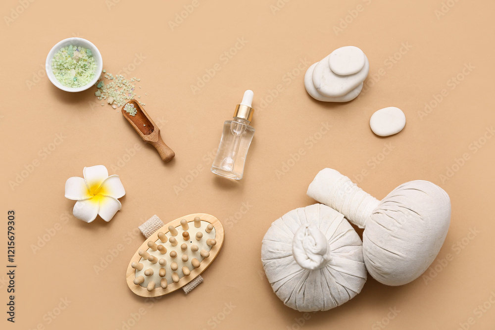Obraz na płótnie Canvas - Herbal bags, spa stones, massage body brush, bottle of cosmetic product and bowl with sea salt on beige background, closeup.
