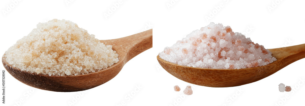Obraz na płótnie Canvas - On a white background, a wooden spoon contains a pile of sea salt.