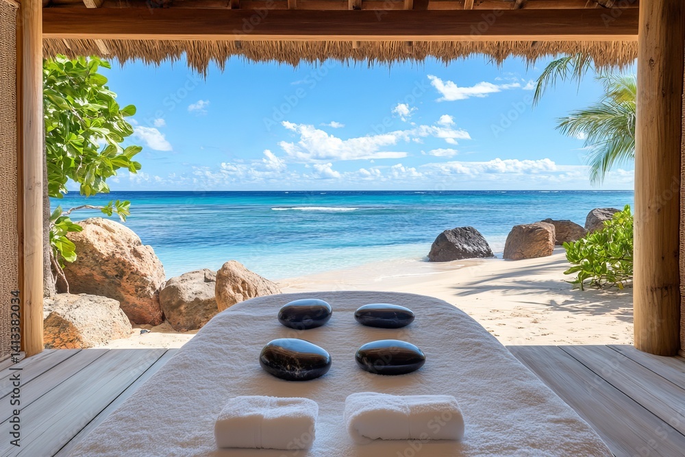 Obraz na płótnie Canvas - Massage table with hot stones overlooking a tropical beach and ocean view from a spa room setting.