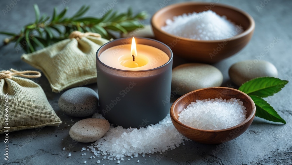 Obraz na płótnie Canvas - Table setup in a spa with burning candle and herbal bags, closeup view.