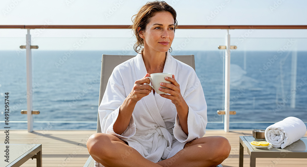 Obraz na płótnie Canvas - Woman relaxing with coffee on cruise ship balcony enjoying ocean view.