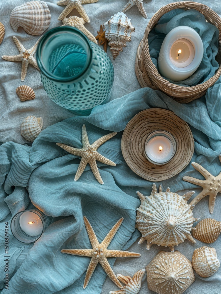 >Obrazy na płótnie Canvas>dynamic flat lay of coastal decor with starfish and lanterns, textured linen surface, minimalist style, bright natural light, pastel blue and beige tones, top-down view