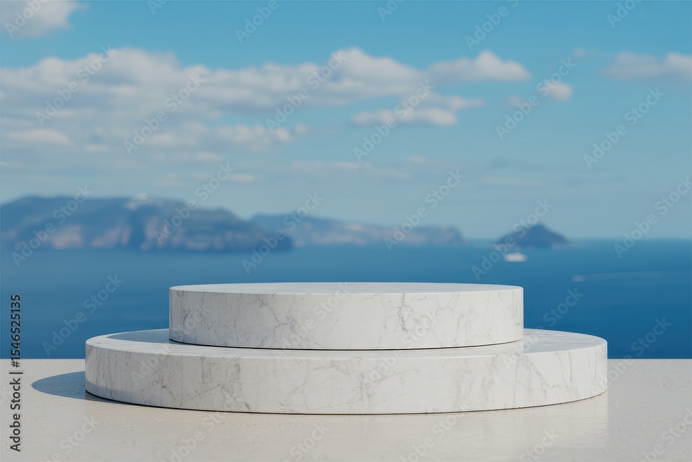 Obraz na płótnie Canvas - White marble podium with sea view on background.