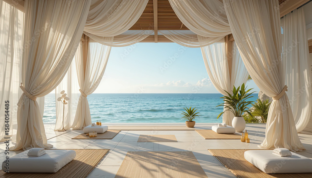 >Obrazy na płótnie Canvas>Beachfront spa pavilion with white curtains and yoga mats overlooking blue sea, peaceful summer retreat location for meditation, wellness escape, tropical resort, and luxury relaxation with ocean view
