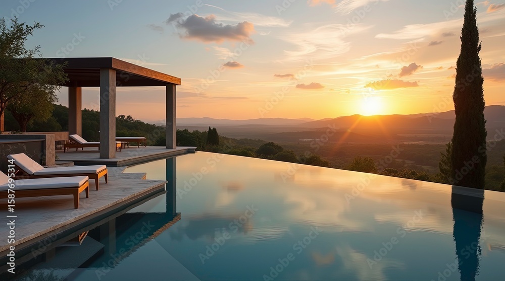 Obraz na płótnie Canvas - A breathtaking view of sunset ocean view modern cliffside home infinity pool..