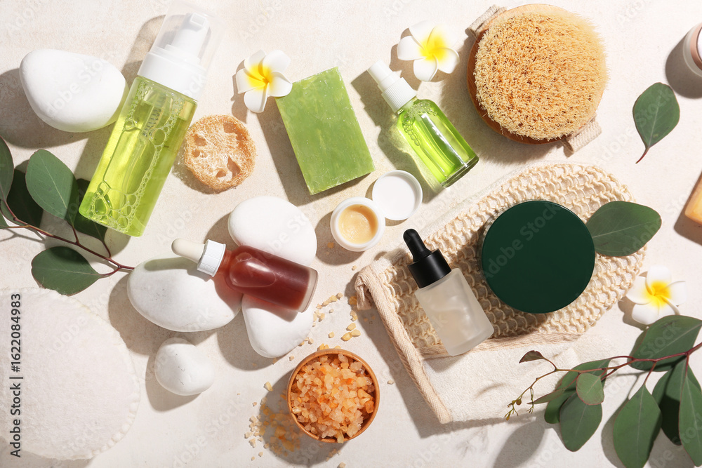 Obraz na płótnie Canvas - Composition with bottles of cosmetic products, spa stones and sea salt on beige grunge background, closeup.