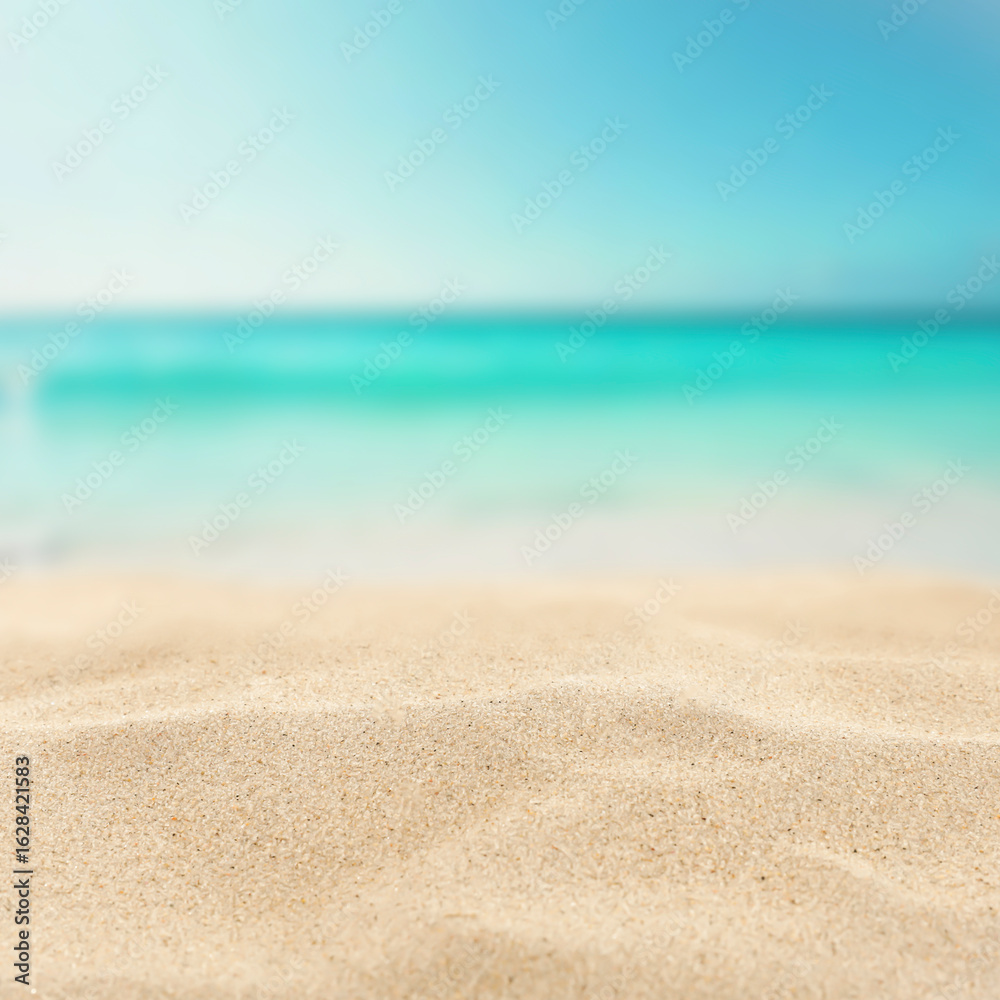 Obraz na płótnie Canvas - Minimalist summer composition of warm golden beach sand with natural space for product placement or text overlay. Blue sky, sunlight and sea view with creative marketing summer vacation concept..