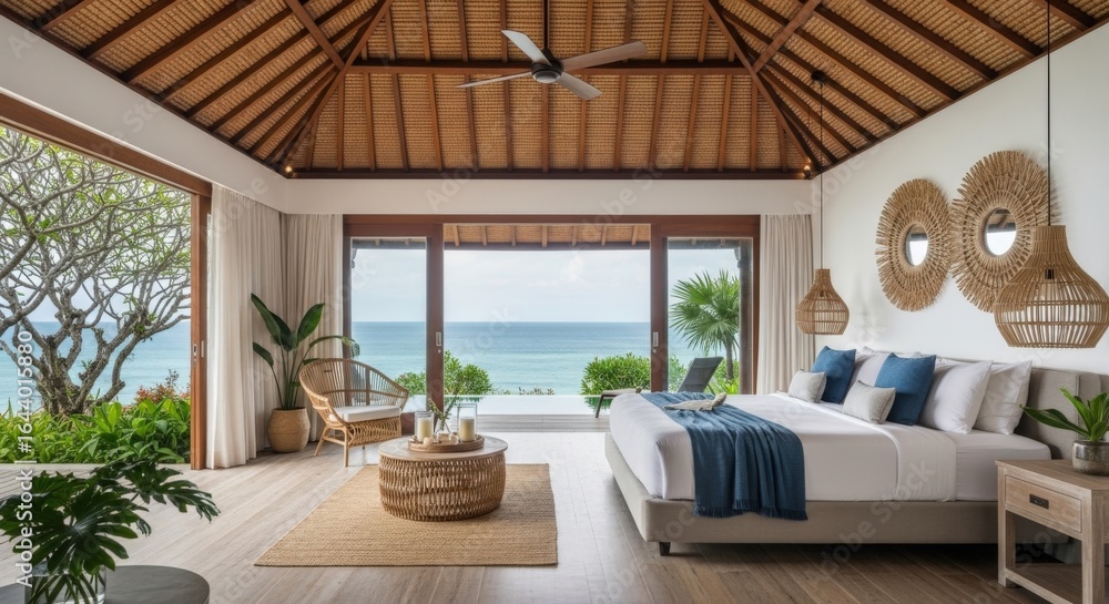 Obraz na płótnie Canvas - bedroom interior with private pool and beach view in tropical hotel and resort.