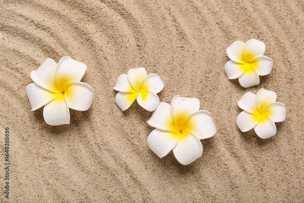 Obraz na płótnie Canvas - Plumeria flowers on sand, top view.