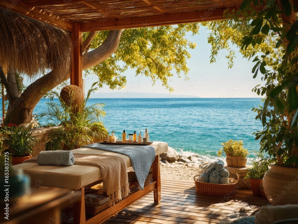 Obraz na płótnie Canvas - Relaxing spa setting by the ocean with natural elements and a serene view.