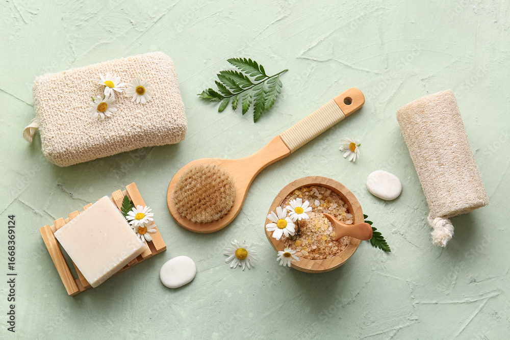 Obraz na płótnie Canvas - Composition with soap bar, massage body brush, chamomile flowers and bowl with sea salt on green grunge background, closeup.