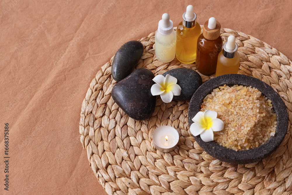 Obraz na płótnie Canvas - Composition with different cosmetic products, spa stones and tropical flowers on table.