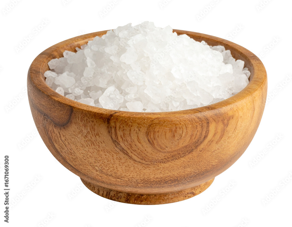 Obraz na płótnie Canvas - Angled Side View of Wooden Bowl with Sea Salt, Detailed Texture, Isolated.