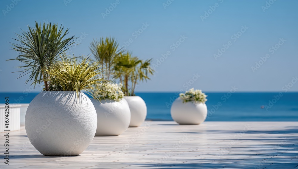 Obraz na płótnie Canvas - White planters with tropical plants by the sea.