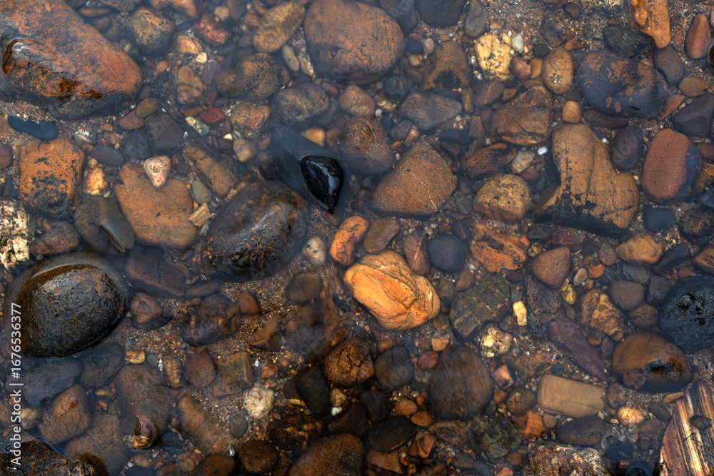 >Obrazy na płótnie Canvas>pebble or gravel and round stone beach in stream shallow water or river and natural clean pond with sea to clear transparent on top view or foot spa nature massage and for pattern texture background