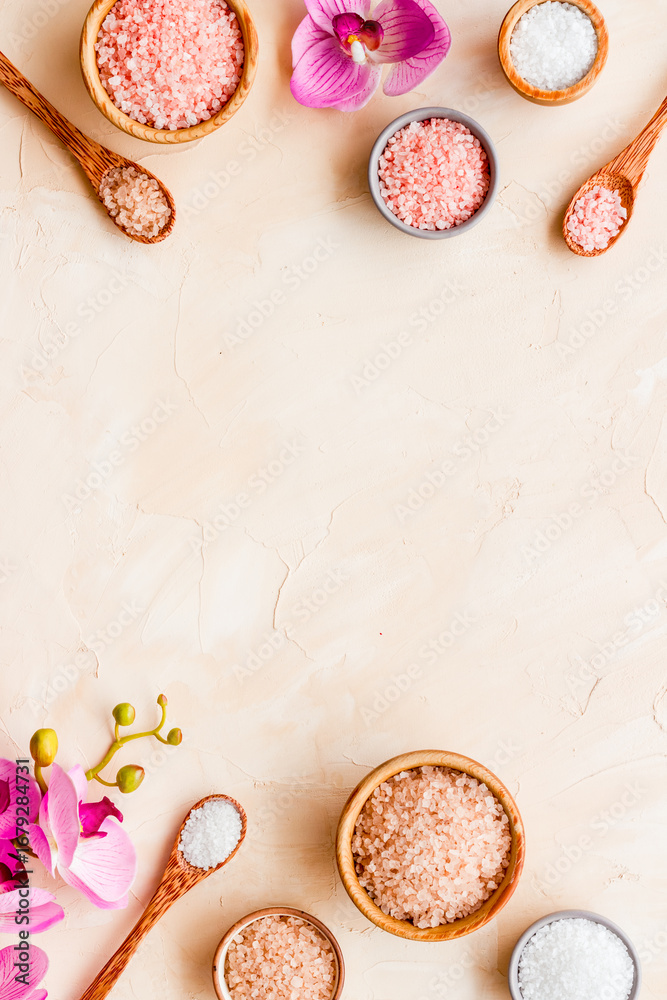 Obraz na płótnie Canvas - Beauty spa therapy cosmetics and wellness flat lay - sea salt in many bowls with flowers, top view.