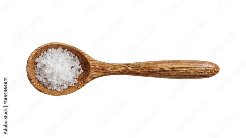Obraz na płótnie Canvas - Top view of wooden salt spoon with seasoned salt isolated on a white background.