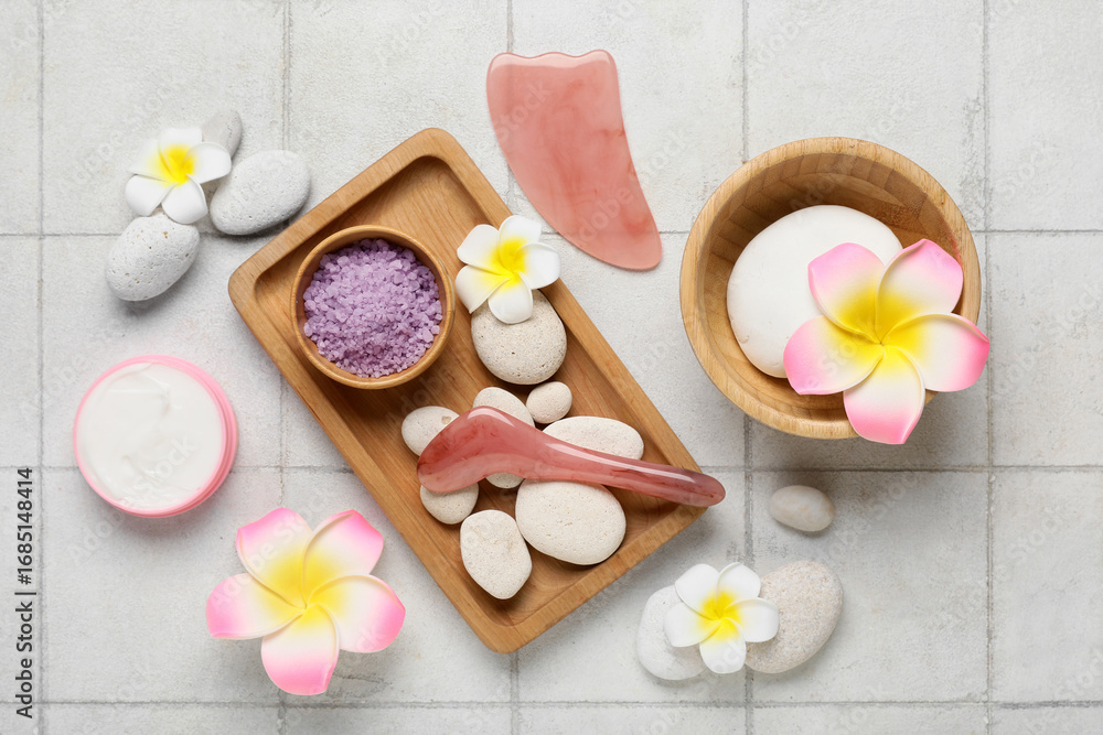 Obraz na płótnie Canvas - Beautiful spa composition with tray, stones, plumeria flowers and bowl with sea salt on beige tile background, closeup.