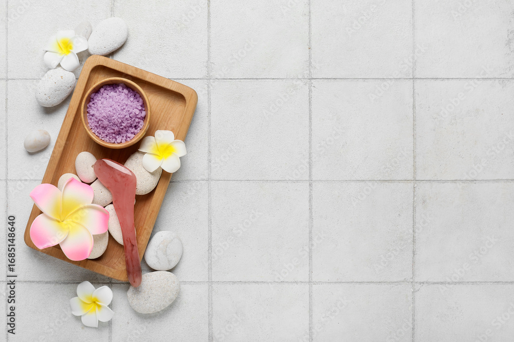 Obraz na płótnie Canvas - Beautiful spa composition with tray, stones, plumeria flowers and bowl with sea salt on beige tile background.