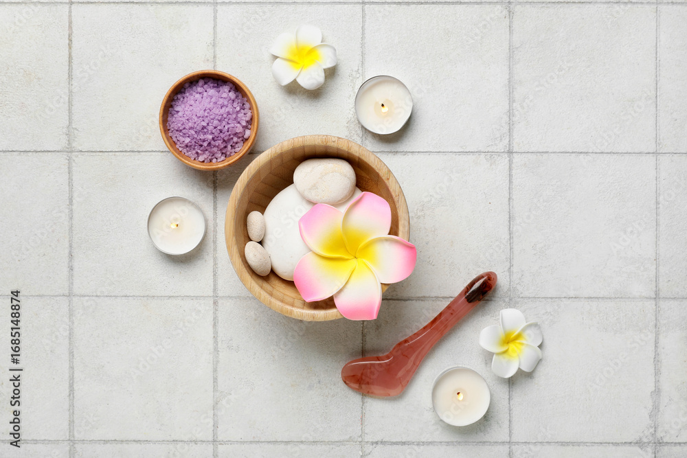 Obraz na płótnie Canvas - Burning candles, bowls with spa stones, plumeria flowers and sea salt on beige tile background.