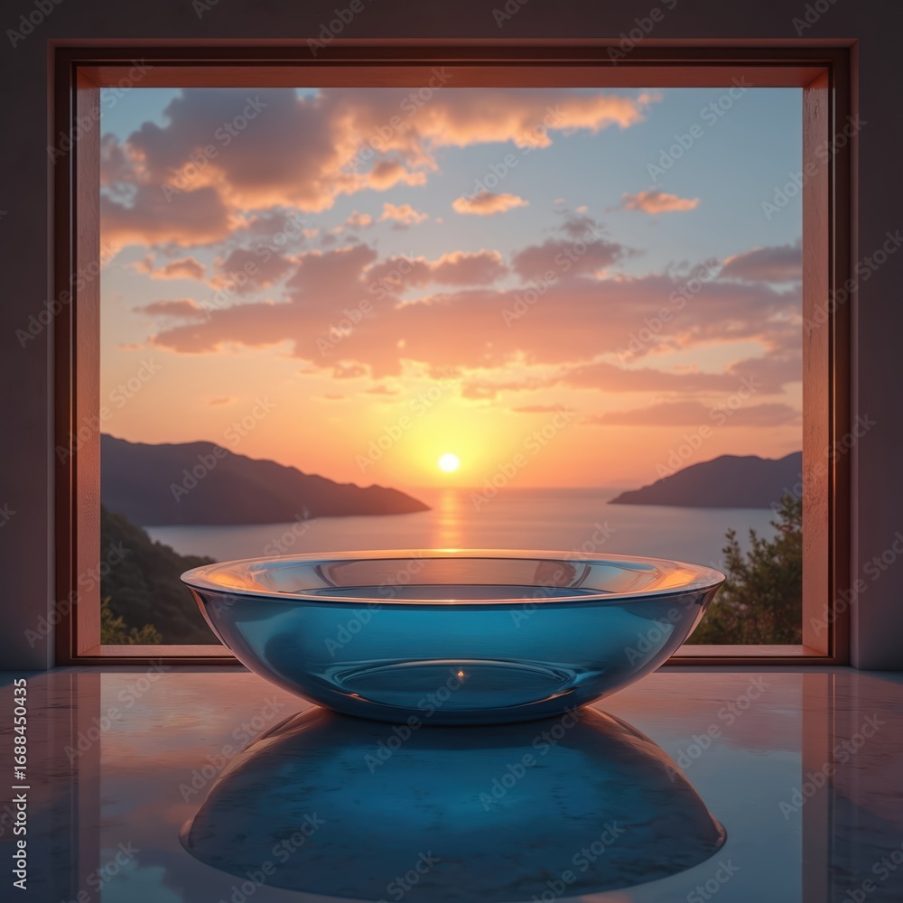 Obraz na płótnie Canvas - Ocean view from balcony with blue glass bowl filled with water. Sun sets over sea creating warm orange glow in sky with scattered clouds. Mountains flank water. Peaceful evening ambiance suggests.