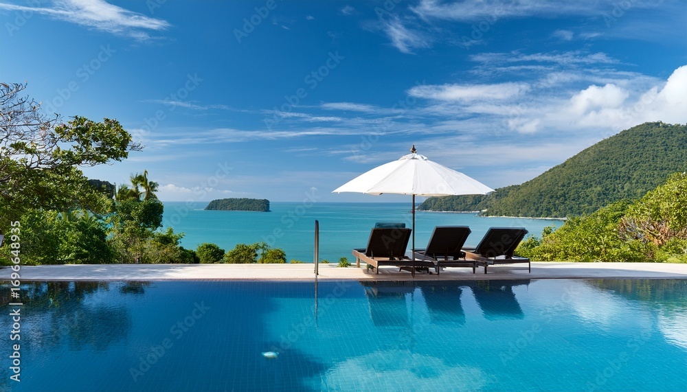 Obraz na płótnie Canvas - white umbrella and lounge chairs by the infinity pool looking over the island ocean view in thailand.