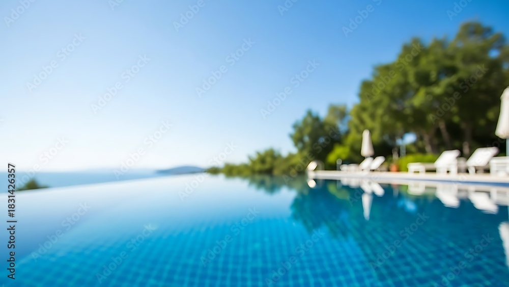 Obraz na płótnie Canvas - Blurred luxury infinity pool with panoramic ocean view under a clear blue sky, ideal for relaxation concepts.