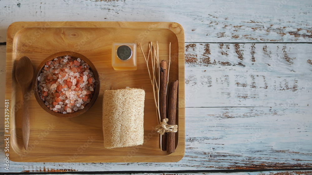 Obraz na płótnie Canvas - Top view Himalayan pink salt crystals on wooden board, scrub spa therapy healthy.spa relax.