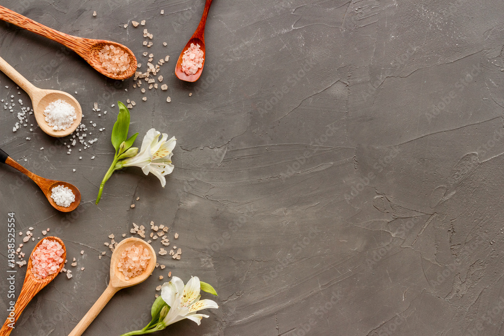 Obraz na płótnie Canvas - Beauty spa therapy cosmetics and wellness flat lay - sea salt in many spoons with flowers, top view.
