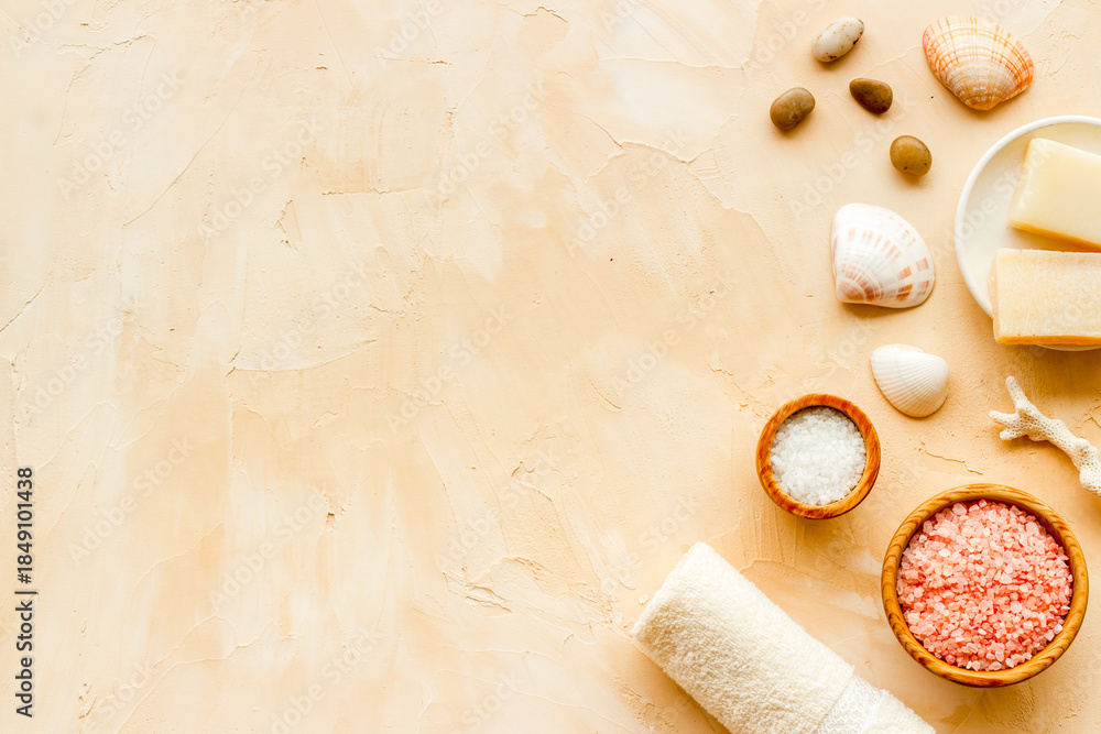 Obraz na płótnie Canvas - Set of body care cosmetics products with essential oil scrubs and sea salt, top view. Aromatherapy spa products.