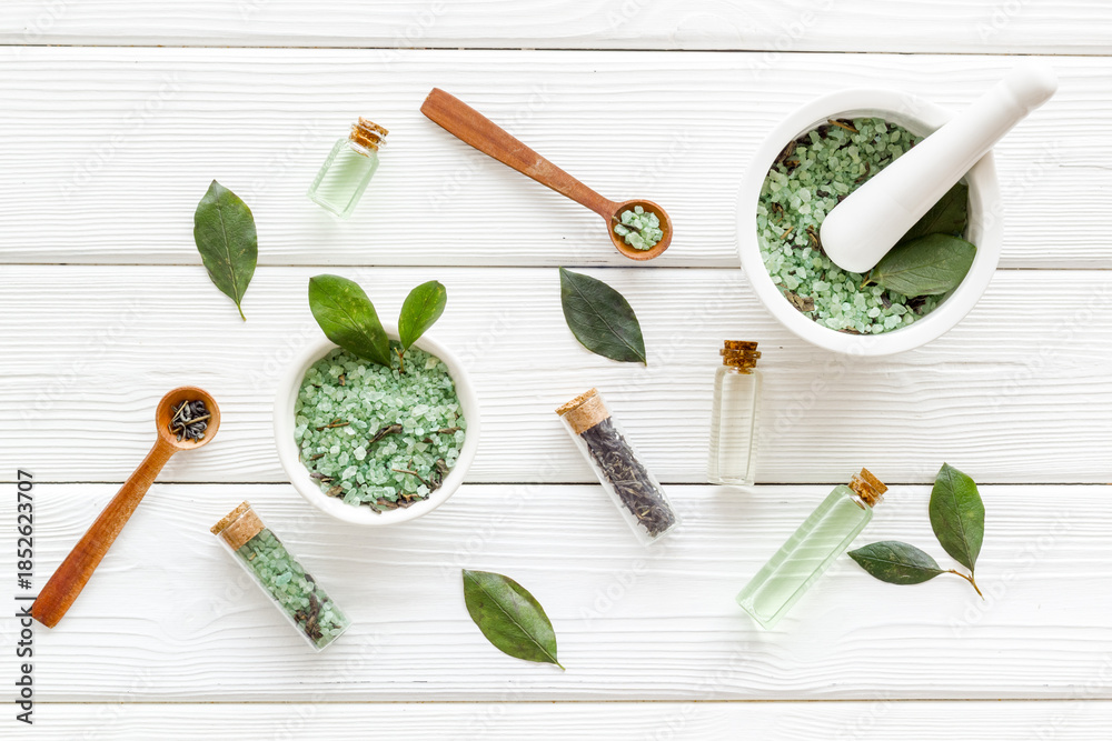Obraz na płótnie Canvas - Homemade organic cosmetics products - tea tree essential oil and sea salt with green leaves, top view.