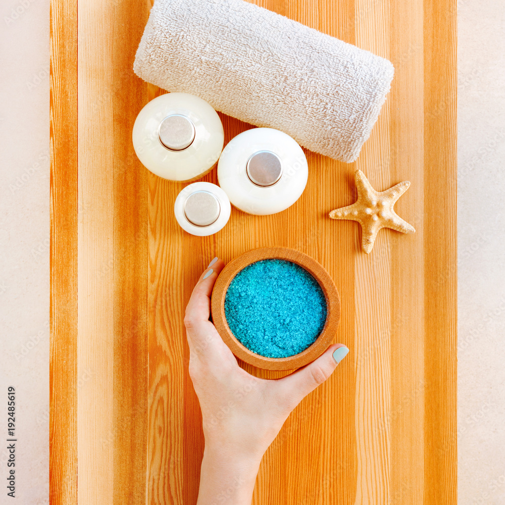 Obraz na płótnie Canvas - Top view of hand, taking a bowl with blue sea salt scrub, standing on wooden table with towel and bottles of spa cosmetic..