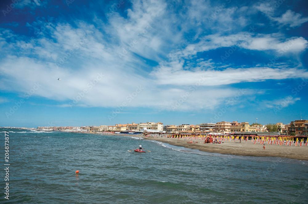 >Obrazy na płótnie Canvas>Overview of the beach and town of Ostia between the Mediterranean sea and sunny sky. The town is a seaside resort and ancient port of Rome. Located in the Lazio region