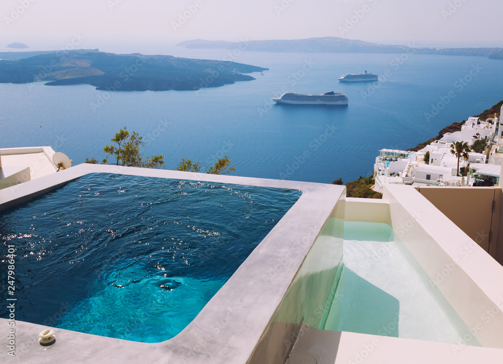 Obraz na płótnie Canvas - Sunny morning view of Santorini island. Famous Greek resort Oia, Greece, Europe. Traveling concept background. .
