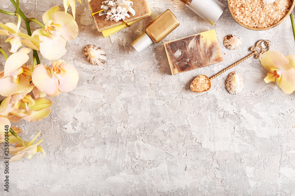 Obraz na płótnie Canvas - Golden spa concept with orchid, shells, sea salt. Top view..