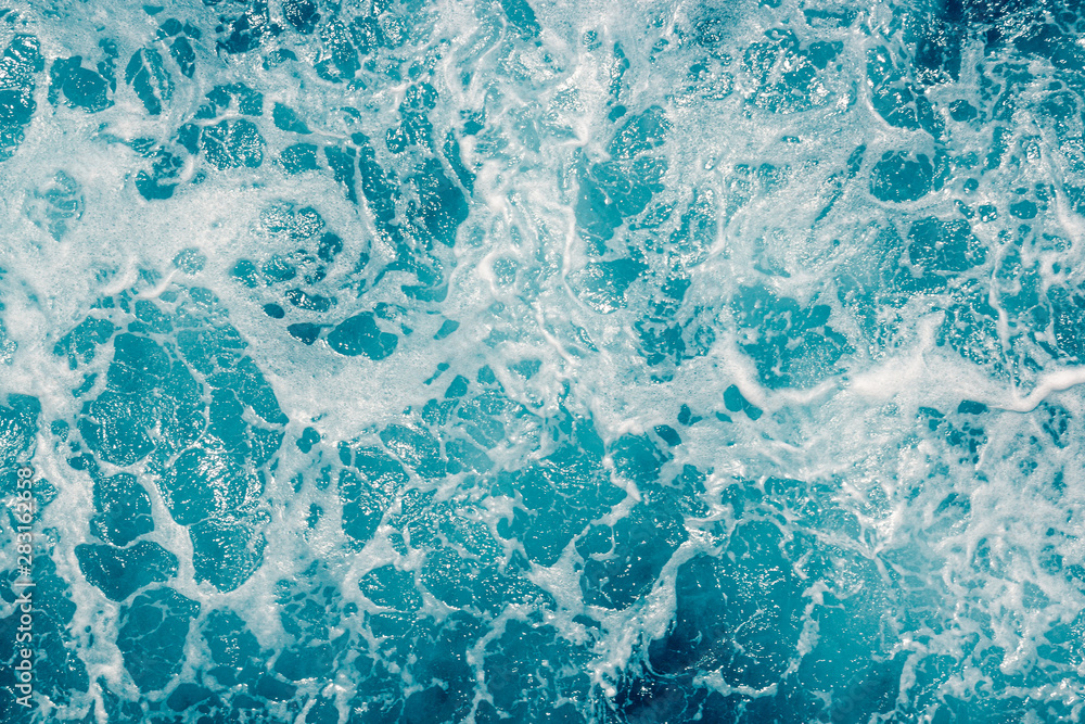 Obraz na płótnie Canvas - Pale blue green sea surface with waves and foam, abstract background.