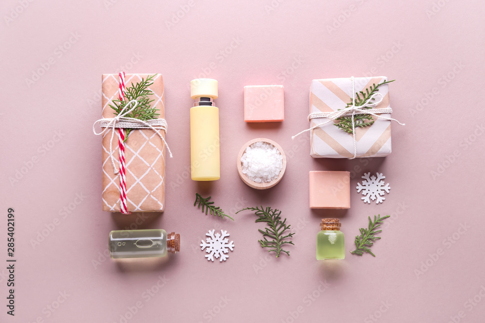 Obraz na płótnie Canvas - Christmas gift boxes and products for spa treatment on color background.