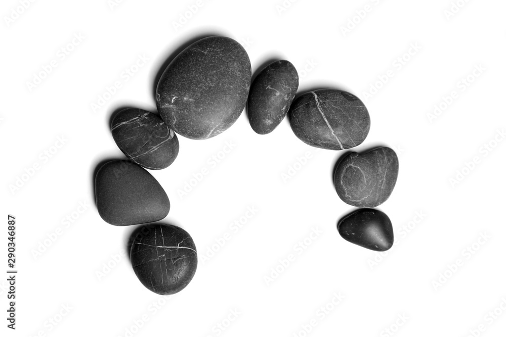 Obraz na płótnie Canvas - Scattered sea pebbles. Smooth gray and black spa stones isolated on white background. Top view.
