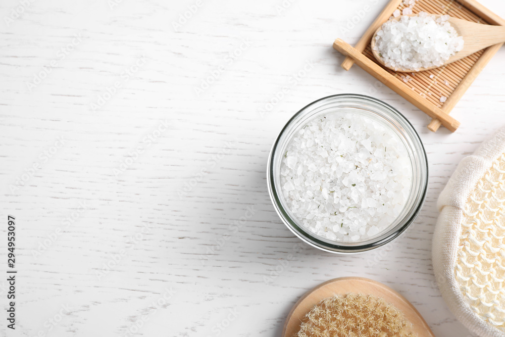 Obraz na płótnie Canvas - Sea salt for spa scrubbing procedure in jar on white wooden table, flat lay.