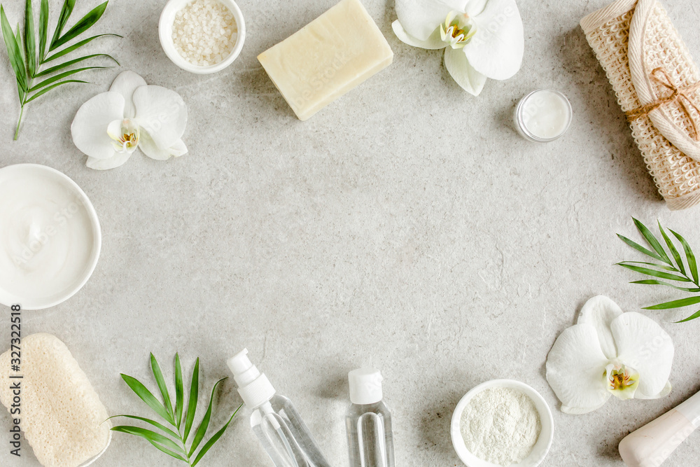 >Obrazy na płótnie Canvas>Spa skincare concept. Natural/Organic spa cosmetics products, sea salt and tropic palm leaves on gray marble table from above. Spa background with a space for a text, flat lay, top view.