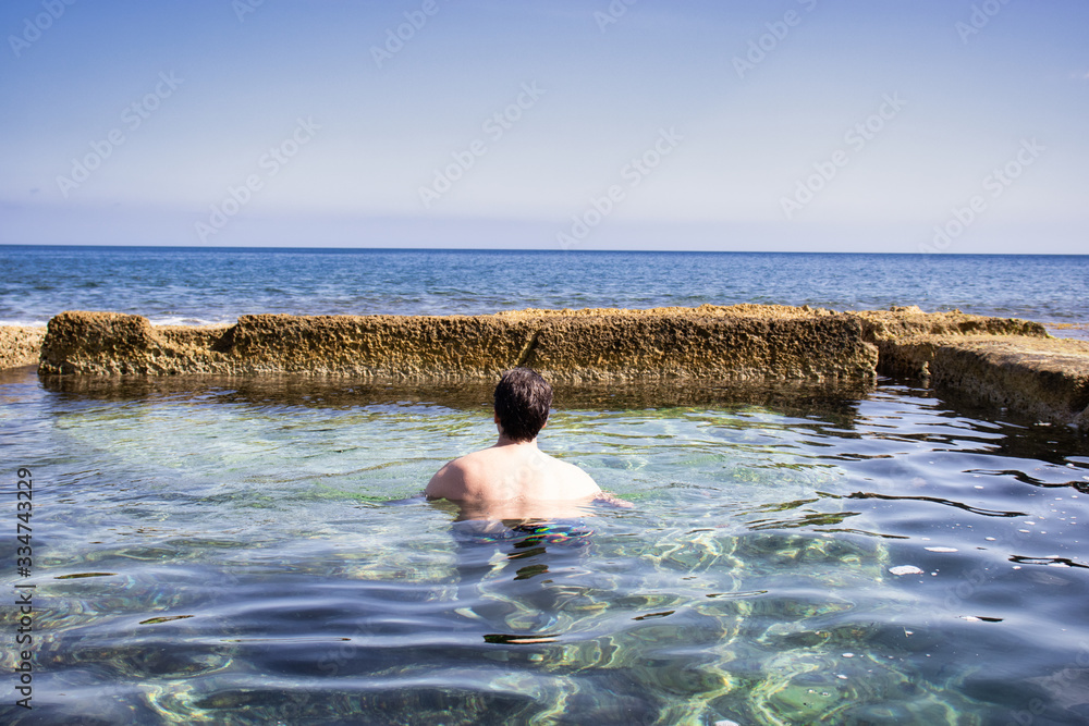 Obraz na płótnie Canvas - Young man enjoying a natural swimmingpool from sea water, enjoying open water space and warm calm water. with sea view.