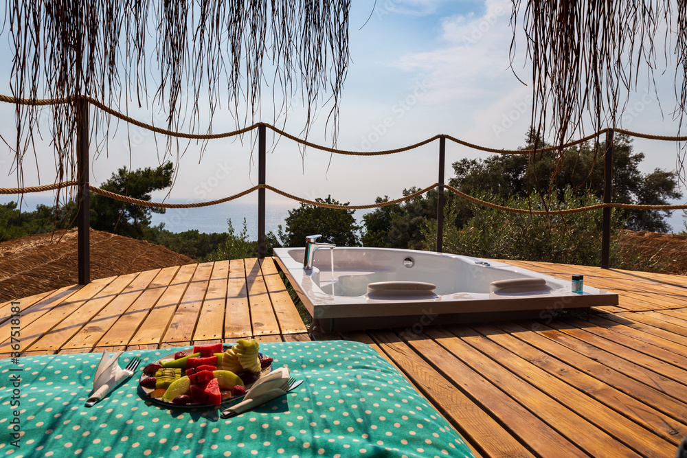Obraz na płótnie Canvas - Hot tub in the room balcony with sea view. Luxury honeymoon romantic vacation place..