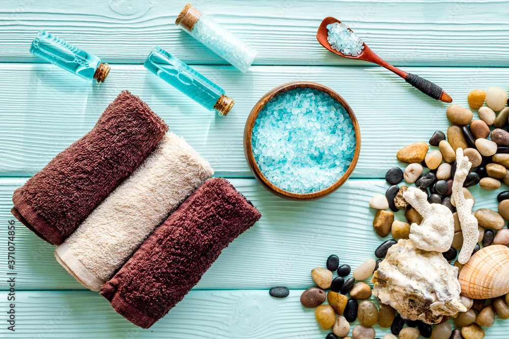 Obraz na płótnie Canvas - Lauout of blue sea spa cosmetics. Top view.