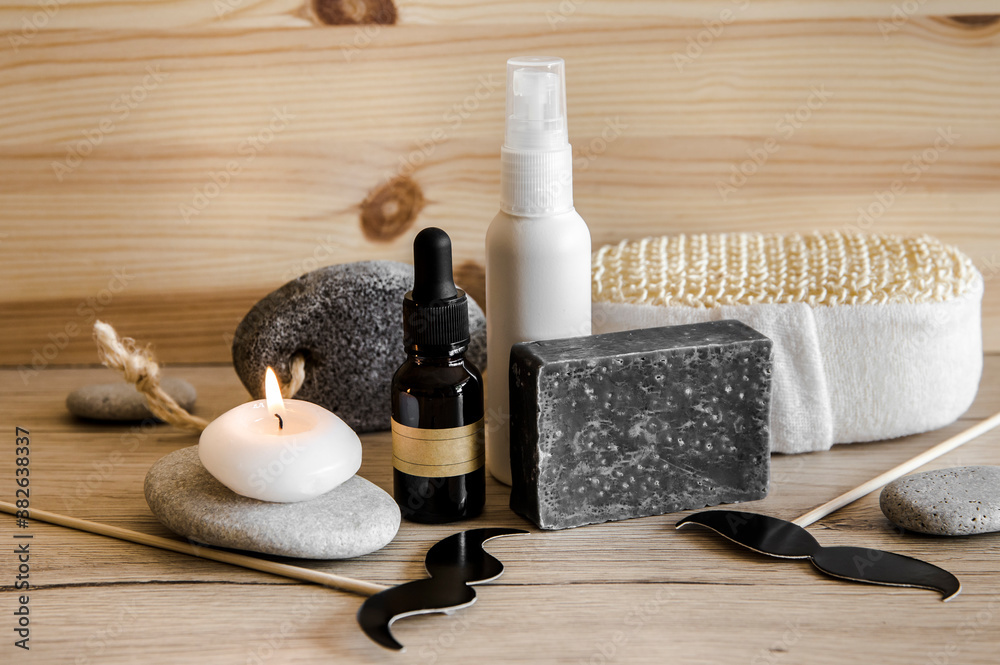 Obraz na płótnie Canvas - Above view set of various man spa products things. Natural wood disc background with flat sea stones. Gray clay soap bar, beard oil, moisturizing cream, candle burning. Funny mustache shape figurines..