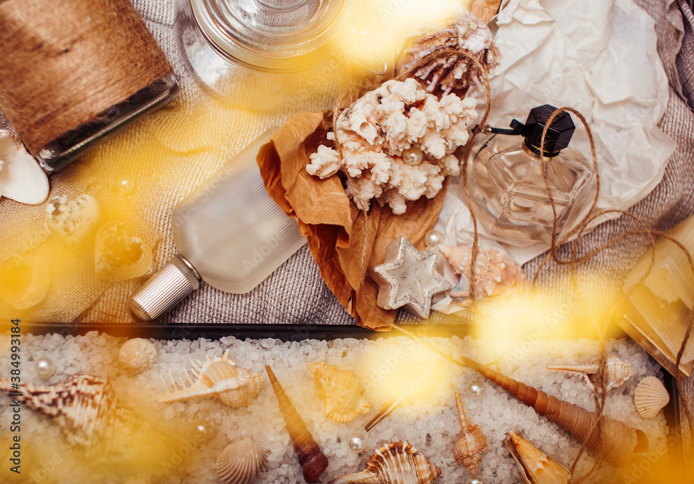 Obraz na płótnie Canvas - a lot of sea theme in mess like shells, candles, perfume, girl stuff on linen, pretty textured post card view vintage.