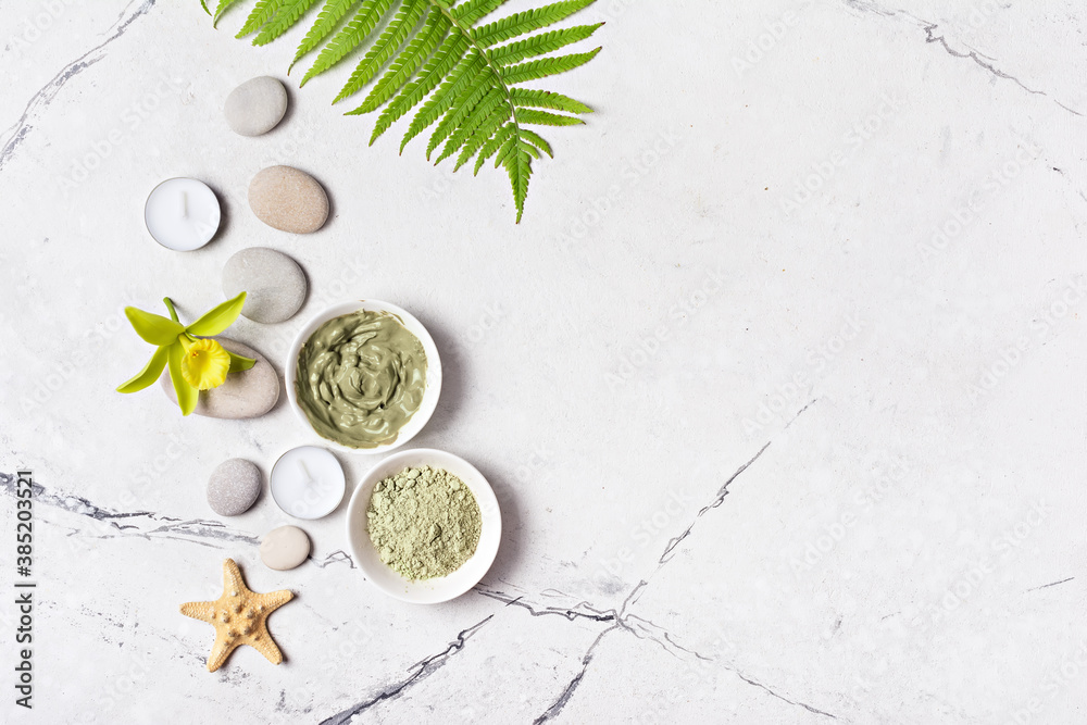 Obraz na płótnie Canvas - Spa background with cosmetic clay, sea stones and aroma candles.