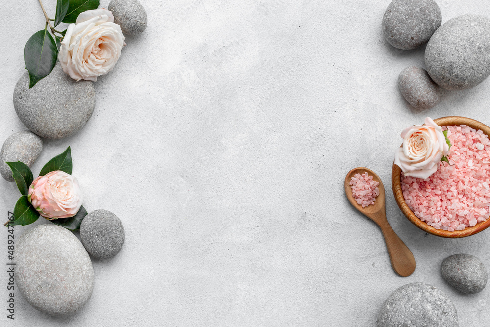 Obraz na płótnie Canvas - Spa stones for massage with roses and sea salt, top view.