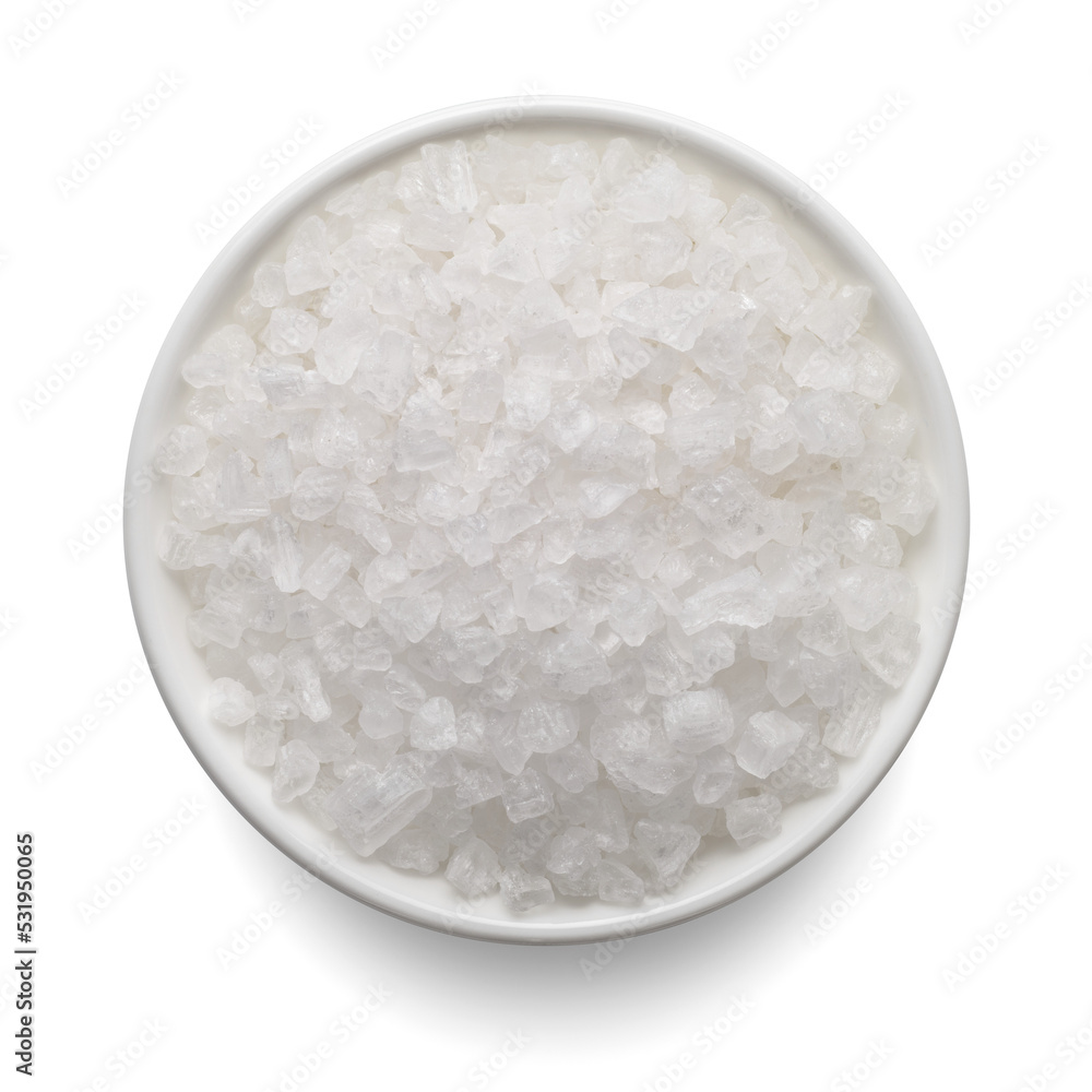 Obraz na płótnie Canvas - Coarse sea salt in white bowl isolated on white. Top view..